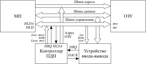 Альтернативой программно-управляемому обмену служит прямой доступ к памяти – способ быстродействующего подключения внешнего устройства, при котором оно обращается к оперативной памяти, не прерывая работы процессора. Такой обмен происходит под управлением отдельного устройства – контроллера DMA (или КПДП).