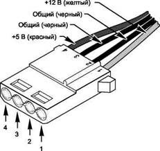 Обратите внимание, что нумерация выводов и обозначение напряжений этих разъемов обратно противоположны. Будьте особенно осторожны, самостоятельно изготавливая кабельный адаптер или используя его для подключения разъемов разных типов. Перемена местами красных и желтых проводов может привести к повреждению подключенного дисковода или периферийного устройства.