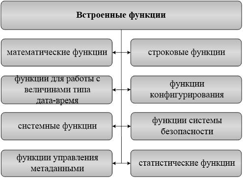 Язык SQL содержит так называемые встроенные функции, которые реализуют некоторые наиболее распространенные алгоритмы. Основной особенностью этих функций является возможность их использования при построении выражений. Встроенные функции, доступные при работе с SQL, можно условно разделить на следующие группы: