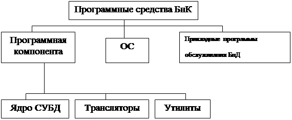 Основу программных средств БнД представляет СУБД. В ней можно выделить ядро СУБД, обеспечивающее организацию ввода, обработки и хранения данных, а также другие компоненты, обеспечивающие настройку системы, средства тестирования, утилиты, обеспечивающие выполнение вспомогательных функций, таких, как восстановление баз данных, сбор статистики о функционировании БнД и др. Важной компонентой СУБД являются трансляторы или компиляторы для используемых ею языковых средств.