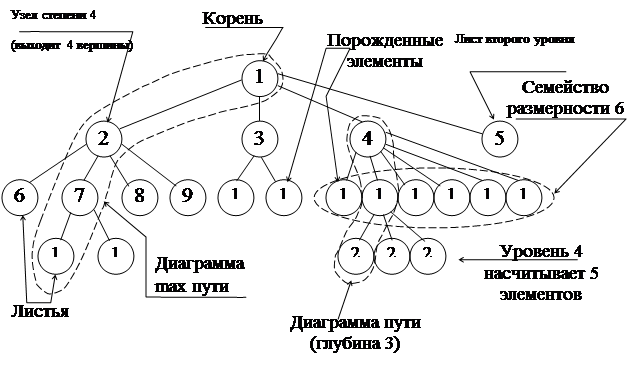 В первом примере самый нижний узел имеет четыре исходных. Во втором примере на рисунке 19 каждый порожденный элемент имеет два исходных. В третьем примере не указано направление отношений, но какой бы узел не был самым нижним, у него будет два исходных.
