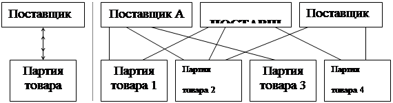 Запись Партия_товара может иметь более одной исходной записи, так как этот товар может поставляться различными поставщиками.