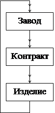 Ситуация, в которой предшественник узла является в то же время его последователем, называются циклом. Отношения исходный – порожденный образуют при этом замкнутый контур. Например, завод выпускает различную продукцию. Некоторые изделия производятся на других заводах. С одним контрактом может быть связано производство нескольких изделий. Представление этих отношений и образует цикл (рисунок 22). Но не все СУБД способны представлять циклы. Специальным типом цикла является цикл, состоящий из одного только типа записи, то есть тип порожденной записи совпадает с типом исходной записи. Эта ситуация называется петлей.