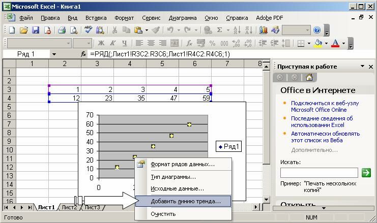 При обработке результатов измерений достаточно часто возникает вопрос о тенденции развития или изменения. В Excel этот вопрос решается при помощи определения тренда. Линии тренда графически иллюстрируют тенденцию изменения рядов данных. Они обычно используются в тех случаях, когда нужно построить диаграммы для задач прогнозирования и экстраполяции (так называемых задач регрессионного анализа). С помощью регрессионного анализа можно продолжить линию тренда вперед или назад, экстраполировать ее за пределы, в которых данные уже известны, и показать тенденцию их изменения. Для построения линии тренда активизируйте ряд данных, после чего нажмите правую клавишу мыши. В появившемся списке команд выберите Добавить линию тренда, а затем в соответствующем окне диалога - рисунок с линейным трендом.