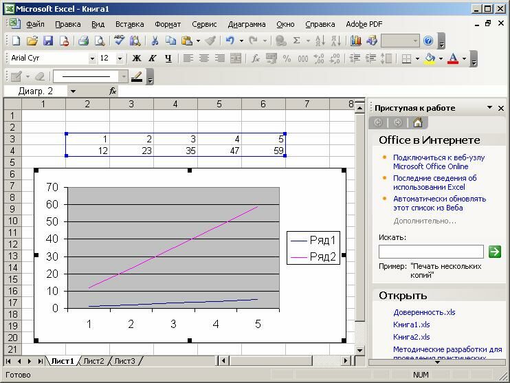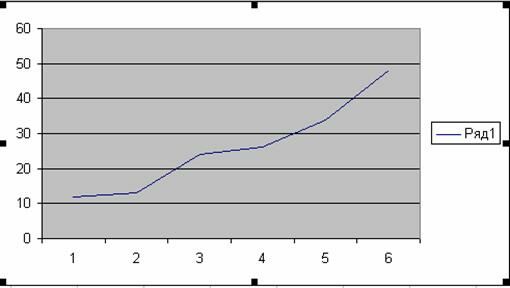 Диаграмма построена, после чего ее нужно отредактировать. В частности, изменить цвет и стиль линий, которыми изображены серии чисел, расположенные в строках таблицы исходных данных. Для этого Вам нужно перейти в режим редактирования диаграммы. Как Вы уже знаете, для этого нужно дважды нажать кнопку мыши на диаграмме. Изменится обрамление диаграммы, появится бордюр. Это свидетельствует о том, что Вы находитесь в режиме редактирования диаграммы.