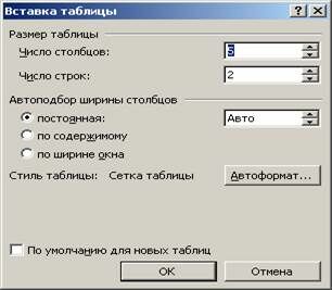 2. в меню Таблица выберите строку Вставить и в ее меню команду Таблица. Появится диалоговое окно Вставка таблицы;