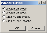 При удалении ячейки появится диалоговое окно Удаление ячеек.