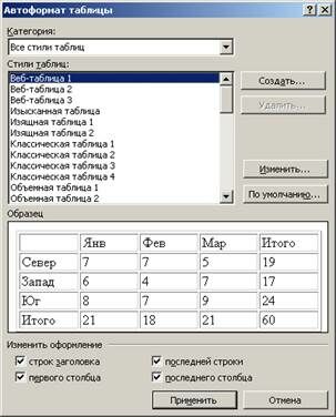 2. Выберите в меню Таблица команду Автоформат. В диалоговом окне Автоформат таблицы в списке Форматы представлены разные форматы таблиц. Можно прокрутить этот список, причем выделенный формат появится в области Образец.