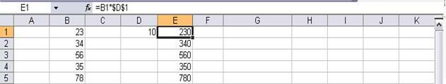 Например. Элементы столбца В умножить на значение содержащееся в ячейке Е1 (рис.4.1). Формула в ячейке E1 выглядит как =B1*$D$1. Как данная формула будет выглядеть при копировании ее в ячейку Е4, G7?