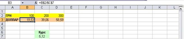 Например. Текущий курс доллара равен 5,12 (ячейка С7). Получить числовое значение, заданное в диапазоне B2:D2, в долларах. Результат поместить в диапазон B3:D3.