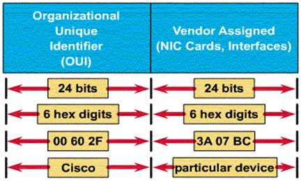MAC-адрес состоит из двух частей – 24-разрядного уникального идентификатора организации (OUI, Organizationally Unique Identifier), назначаемого Комитетом IEEE каждому производителю оборудования, и 24-разрядного номера, назначаемого самим производителем для каждой изготовленной им платы. Например: 00-60-2F-3A-07-BC.