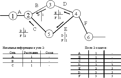 На рисунке приведена начальная информация, содержащаяся в топологической базе маршрутизатора 2, а также информация в этой же базе после двух итераций обмена маршрутными пакетами протокола RIP. После определенного числа итераций маршрутизатор 2 будет знать о расстояниях до всех сетей интерсети, причем у него может быть несколько альтернативных вариантов отправки пакета к сети назначения. Пусть в нашем примере сетью назначения является сеть D.
