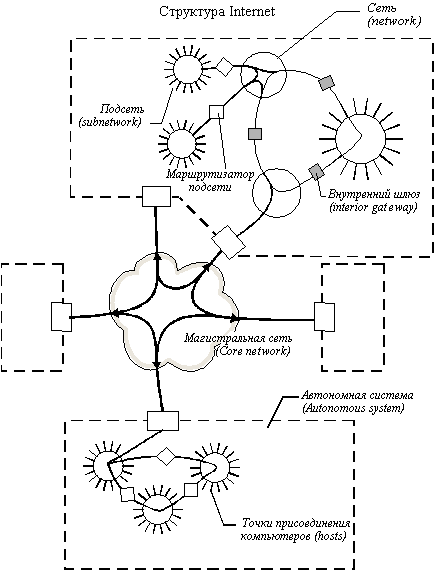 Internet изначально строилась как сеть, объединяющая большое количество существующих систем. С самого начала в ее структуре выделяли магистральную сеть (core backbone network), а сети, присоединенные к магистрали, рассматривались как автономные системы (autonomous systems). Магистральная сеть и каждая из автономных систем имели свое собственное административное управление и собственные протоколы маршрутизации. Общая схема архитектуры сети Internet показана на рисунке 8.3. Далее маршрутизаторы будут называться шлюзами для следования традиционной терминологии Internet.