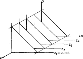 На рисунке 1 приведен пример, где указанные параллельные плоскости определяются постоянными значениями z. Функция F(x, у, z) = 0 сводится к последовательности кривых, лежащих в каждой из этих параллельных плоскостей, например к последовательности функций вида у = f(x, z) где z постоянно на каждой из заданных параллельных плоскостей.