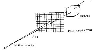 Трассировка лучей является методом грубой силы. Главная идея, лежащая в основе этого метода, заключается в том, что наблюдатель видит любой объект посредством испускаемого неким источником света, который падает на этот объект и затем каким-то путем доходит до наблюдателя. Свет может достичь наблюдателя, отразившись от поверхности, преломившись или пройдя через нее. Если проследить за лучами света, выпушенными источником, то можно убедиться, что весьма немногие из них дойдут до наблюдателя. Следовательно, этот процесс был бы вычислительно неэффективен. Аппель первым предложил отслеживать (трассировать) лучи в обратном направлении, т. е. от наблюдателя к объекту, как показано на рис. 4