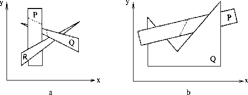Другие трудности показаны на рис. 2. Здесь многоугольники циклически перекрывают друг друга. На рис. 2, а Р находится впереди Q, который лежит впереди R, который, в свою очередь, находится впереди Р. На рис. 2, b Р экранирует Q, a Q экранирует Р. Аналогичное циклическое экранирование возникает при протыкании многоугольников.