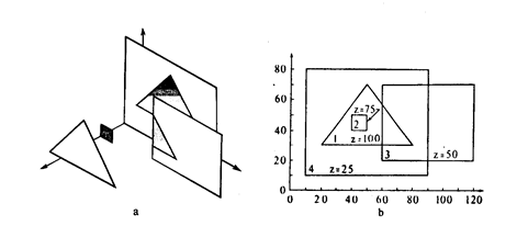 Для простой сцены, вроде той, что показана на рис. 1, а, окончательный список приоритетов можно получить непосредственно. Например, эти многоугольники можно упорядочить по их максимальному или минимальному значению координаты z. Однако уже для сцены, показанной на рис.1, b, окончательный список приоритетов по глубине невозможно получить простой сортировкой по z. Если Р и Q с рис. 1, b упорядочены по минимальному значению координаты z (zmin), окажется, что P в списке приоритетов по глубине будет стоять перед Q. Если их записать в буфер кадра в таком порядке, то получится, что Q частично экранирует Р. Однако фактически Р частично экранирует Q. Правильный порядок в списке приоритетов будет тогда, когда Р и Q поменяются местами.