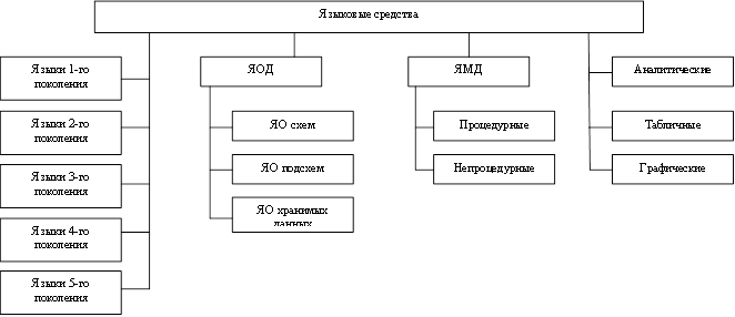 Языковые средства большинства современных СУБД относятся к языкам четвертого поколения (к первому относят машинные языки, ко второму – символические языки Ассемблера, к третьему – алгоритмические языки типа Кобол и т.п. – языки высокого уровня, пятый уровень – языки систем искусственного интеллекта).