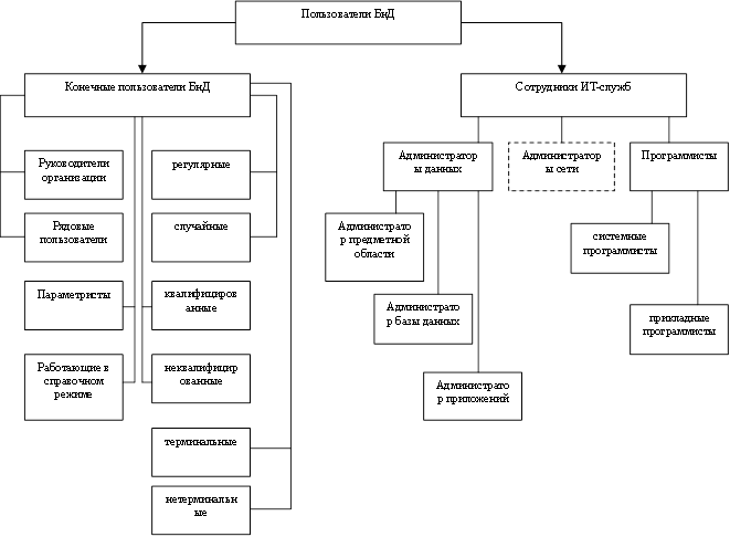 В процессе создания и эксплуатации БнД с ним взаимодействуют пользователи разных категорий (рис.1.4). БД создаются для удовлетворения потребностей конечных пользователей. Чаще всего – это специалисты конкретных предметных областей, использующие БД для выполнения своих профессиональных обязанностей.