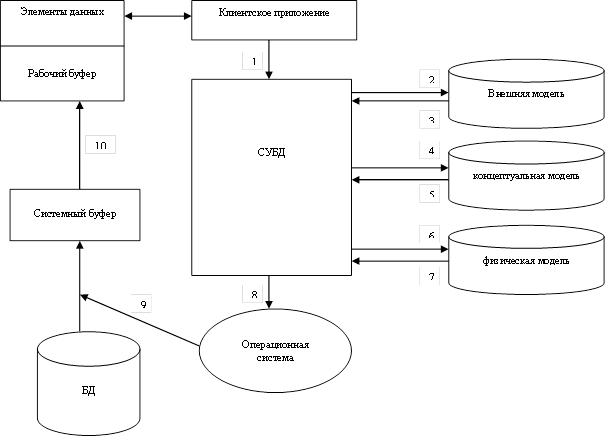 4) СУБД запрашивает информацию о местоположении данных на физическом уровне (6,7).