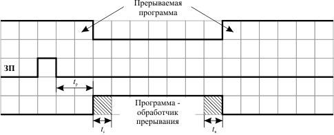 Рис. 1. Выполнение прерывания в компьютере: tр - время реакции процессора на запрос прерывания; tс - время сохранения состояния прерываемой программы и вызова обработчика прерывания; tв - время восстановления прерванной программы