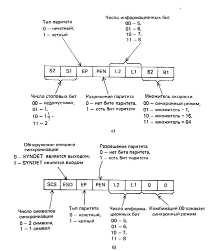 В обоих режимах биты 2 и 3 показывают число информационных бит в каждом символе, бит 4 определяет наличие или отсутствие бита паритета, а бит 5 - тип паритета (нечетный или четный). В асинхронном режиме два старших бита показывают число стоповых бит. Для синхронного режима бит 6 показывает, каким является сигнал SYNDET-входным или выходным, а бит 7 задает число символов синхронизации