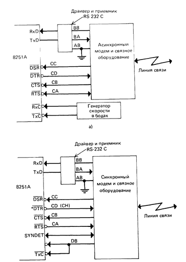 Рис. 9.17. Подключения микросхемы 8251А к асинхронному (а) и синхронному (б) модему Примечание. Подключения линий управления зависят от спецификаций модема