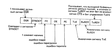 пустой. В отличие от контакта TxRDY на этот бит не влияет входной сигнал CTS или бит управления TxEN. Бит RxRDY показывает, что символ принят и готов для ввода в процессор. Биты TxRDY и RxRDY можно использовать для программного ввода-вывода, а сигналы с соответствующих контактов можно подключить к линиям запросов прерываний для организации ввода-вывода по прерываниям. Бит TxRDY автоматически сбрасывается, когда имеется символ для передачи, а бит RxRDY - когда установивший его символ введен процессором. Бит 2 показывает, что регистр сдвига передатчика ожидает загрузки символа из буферного регистра выходных данных. В синхронной передаче, пока этот бит установлен, передатчик будет брать данные из регистров символов синхронизации до загрузки данных в буферный регистр выходных данных. Биты 3, 4 и 5 показывают ошибки паритета, перегрузки и кадра. Когда обнаруживается ошибка, соответствующий ей бит устанавливается в 1. Если инверсию выхода DSR подключить к линии СС, то бит 7 отражает состояние модема - он устанавливается в 1, когда модем включен и находится в рабочем режиме.