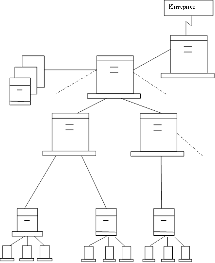 Для организации связи между удаленными подразделениями строится магистральная сеть. Для выхода на магистральную сеть используется сеть Интернет. Серверы обращений управляют связями между центральным сервером и локальными серверами. Корпоративные серверы выполняют такие функции как: работа с центральной базой данных (сервер БД), управление электронным документооборотом, управление электронной почтой, управление выходом в Интернет и т.д.