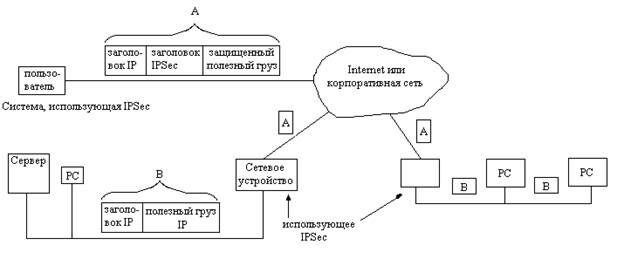 · Протоколы IPSec используются для обмена данными через корпоративную или открытую внешнюю глобальную сеть. Эти протоколы действуют в устройствах действуют в устройствах по периметру сети, например, в маршрутизаторах или брандмауэрах, через которые локальные сети соединены с внешним миром. Благодаря такому устройству: