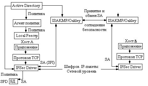 Протокол IPSec в Win2000 включает несколько компонентов, каждый из которых активизируется на разных этапах функционирования протокола.