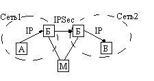 В брандмауэре сети В внешний заголовок IP удаляется, а внутренний пакет доставляется узлу В. Промежуточные маршрутизаторы видят только внешний заголовок IP.