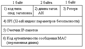 2) AH (Authentication Header) – предусматривает аутентификацию источника данных, проверку их целостности и подлинности после приема, а также защиту от навязывания повторных сообщений (от атак воспроизведения).