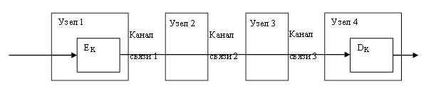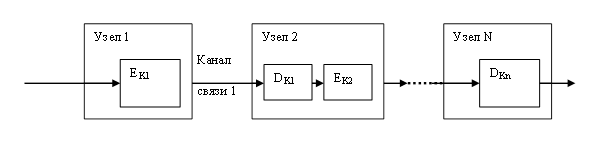 Данный подход позволяет избежать недостатков канального шифрования. Исходные данные шифруются источником и в шифрованном виде передаются без изменения через всю сеть к адресату.