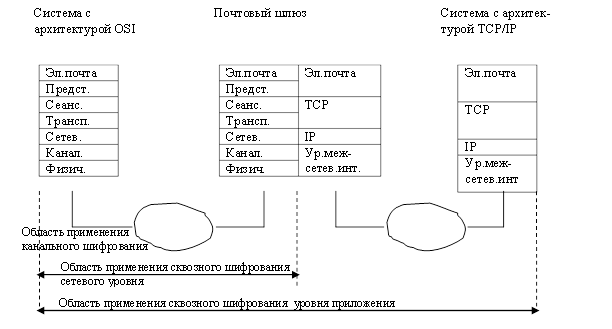 Шифрование выполняется на высших уровнях OSI и только в двух конечных системах.