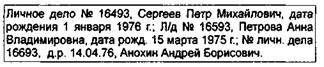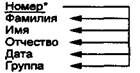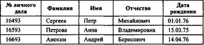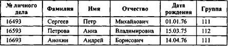 Пример 15.1. На рис. 15.1 пример неструктурированных данных, содержащих сведе­ния о студентах (номер личного дела, фамилию, имя, отчество и год рождения). Легко убедиться, что сложно организовать поиск необходимых данных, хранящихся в неструктурированном виде, а упорядочить подобную информацию практически не представляется реальным.