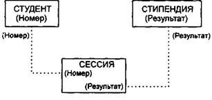 Пример 15.7. На рис. 15.13 показан пример реляционной модели, построенной на ос­нове отношений: СТУДЕНТ, СЕССИЯ, СТИПЕНДИЯ.