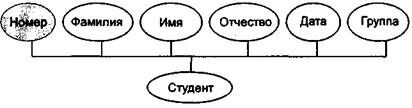 В информационном объекте Студент ключом является реквизит Номер (№ личного дела), к описательным реквизитам относятся: Фамилия (Фамилия студента), Имя (Имя студента), Отчество (Отчество студента), Дата (Дата рождения), Группа (№ группы). Если отсутствует реквизит Номер, то для однозначного определения харак­теристик конкретного студента необходимо использование составного ключа из трех реквизитов: Фамилия + Имя + Отчество.