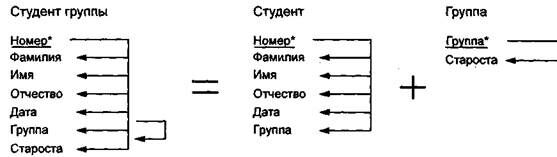 Пример 15.14. "Расщепление" информационного объекта, содержащего транзитив­ную зависимость описательных реквизитов, показано на рис. 15.18. Как видно из рис. 15.17, исходный информационный объект Студент группы пред­ставляется в виде совокупности правильно структурированных информационных объ­ектов (Студент и Группа), реквизитный состав которых тождественен исходному объекту. Отношение Студент = (Номер, Фамилия, Имя, Отчество, Дата, Группа) нахо­дится одновременно в первой, второй и третьей нормальной форме.