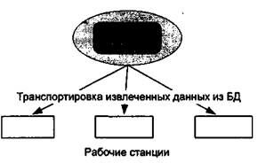 Клиент-сервер. В этой концепции подразумевается, что помимо хранения централи­зованной базы данных центральная машина (сервер базы данных) должна обеспечивать вы­полнение основного объема обработки данных. Запрос на данные, выдаваемый клиентом (рабочей станцией), порождает поиск и извлечение данных на сервере. Извлеченные данные (но не файлы) транспортируются по сети от сервера к клиенту. Спецификой архитектуры клиент-сервер является использование языка запросов SQL. Концепция клиент-сервер ус­ловно изображена на рис. 15.4.