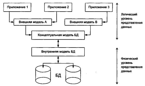 Различают концептуальный, внутренний и внешний уровни представления данных баз данных, которым соответствуют модели аналогичного назначения.