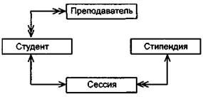 Пример 15.20. На рис. 15.25 представлена графическая форма информационно-логи­ческой модели, связывающей информационные объекты: Студент, Сессия, Стипен­дия, Преподаватель.
