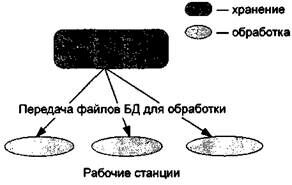 Файл-сервер. Архитектура систем БД с сетевым доступом предполагает выделение одной из машин сети в качестве центральной (сервер файлов). На такой машине хранится совместно используемая централизованная БД. Все другие машины сети выполняют функ­ции рабочих станций, с помощью которых поддерживается доступ пользовательской системы к централизованной базе данных. Файлы базы данных в соответствии с пользова­тельскими запросами передаются на рабочие станции, где в основном и производится обра­ботка. При большой интенсивности доступа к одним и тем же данным производительность информационной системы падает. Пользователи могут создавать также на рабочих станци­ях локальные БД, которые используются ими монопольно. Концепция файл-сервер условно отображена на рис. 15.3.