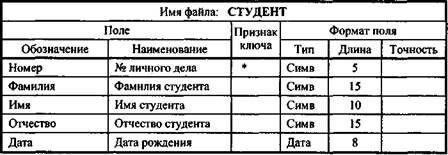 Пример 15.3. На рис. 15.7 приведен пример описания логической структуры записи файла (таблицы) СТУДЕНТ, содержимое которого приводится на рис 15.2. Структура записи файла СТУДЕНТ линейная, она содержит записи фиксированной длины. По­вторяющиеся группы значений полей в записи отсутствуют. Обращение к значению поля производится по его номеру.