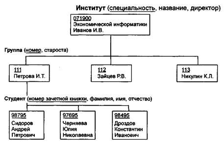 Для рассматриваемого примера иерархическая структура правомерна, так как каждый студент учится в определенной (только одной) группе, которая относится к опреде­ленному (только одному) институту.
