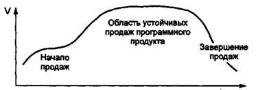 Вначале продажа программного продукта идет вверх — возрастающий участок кривой. Затем наступает стабилизация продаж программного продукта. Фирма-разработчик стремится к максимальной длительности периода стабильных продаж на высоком уровне. Далее происходит падение объема продаж, что является сигналом к изменению маркетинговой политики фирмы в отношении данного программного продукта, требуется модификация данного продукта, изменение цены или снятие с продажи.