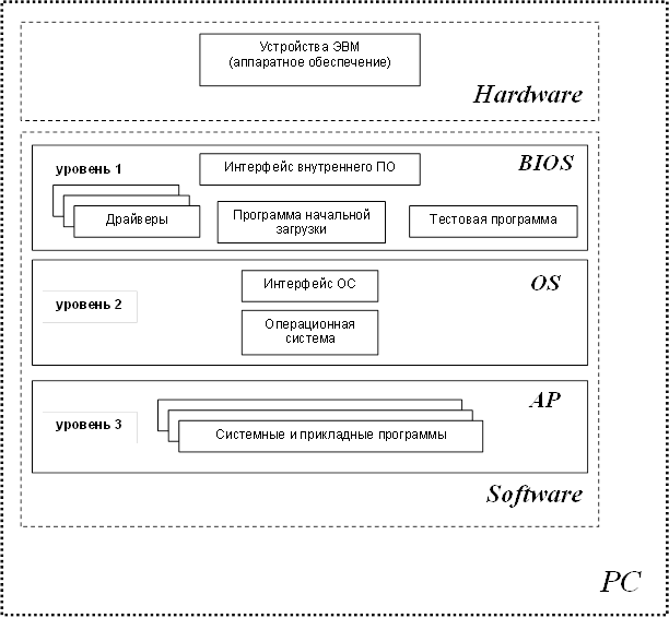 Программы первого уровня хранятся в ПЗУ и работают непосредственно с аппаратурой ЭВМ. Таким образом, все подобные программы являются неотъемлемой частью конкретной ЭВМ. Поэтому набор таких программ называют внутренним программным обеспечением – BIOS (см.выше). В состав BIOS входят: