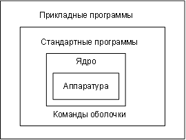 Ядро определяет программный интерфейс. На втором уровне находятся стандартные программы ОС и оболочка, которые работают с ядром и предоставляют пользовательский интерфейс. Программы второго уровня стараются делать машинно-независимыми. В идеале замена ядра равнозначна замене версии операционной системы.