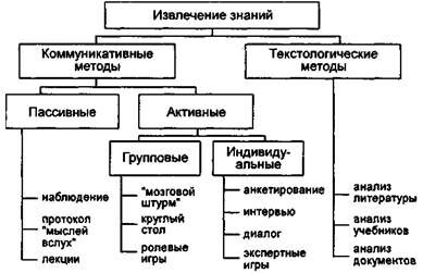 В свою очередь, коммуникативные методы можно также разделить на две группы: активные и пассивные. Пассивные методы подразумевают, что ведущая роль в процедуре извлечения знаний как бы передается эксперту, а инженер по знаниям только протоколирует рассуждения эксперта во время его реальной работы по принятию решений или записывает то, что эксперт считает нужным самостоятельно рассказать в форме лекции. В активных методах, напротив, инициатива полностью в руках инженера по знаниям, который активно контактирует с экспертом различными способами — в играх, диалогах, беседах за "круглым столом" и т.д.