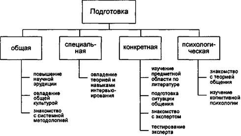 Это определение не означает, что к свободному диалогу не надо готовиться. Напротив, внешне свободная и легкая форма этого метода требует высочайшей профессиональной и психологической подготовки. Подготовка к свободному диалогу практически может совпадать с предлагаемой в подготовкой к журналистскому интервью. Рис. 17.11 графически иллюстрирует схему такой подготовки, дополненную в связи со спецификой инженерии знаний.